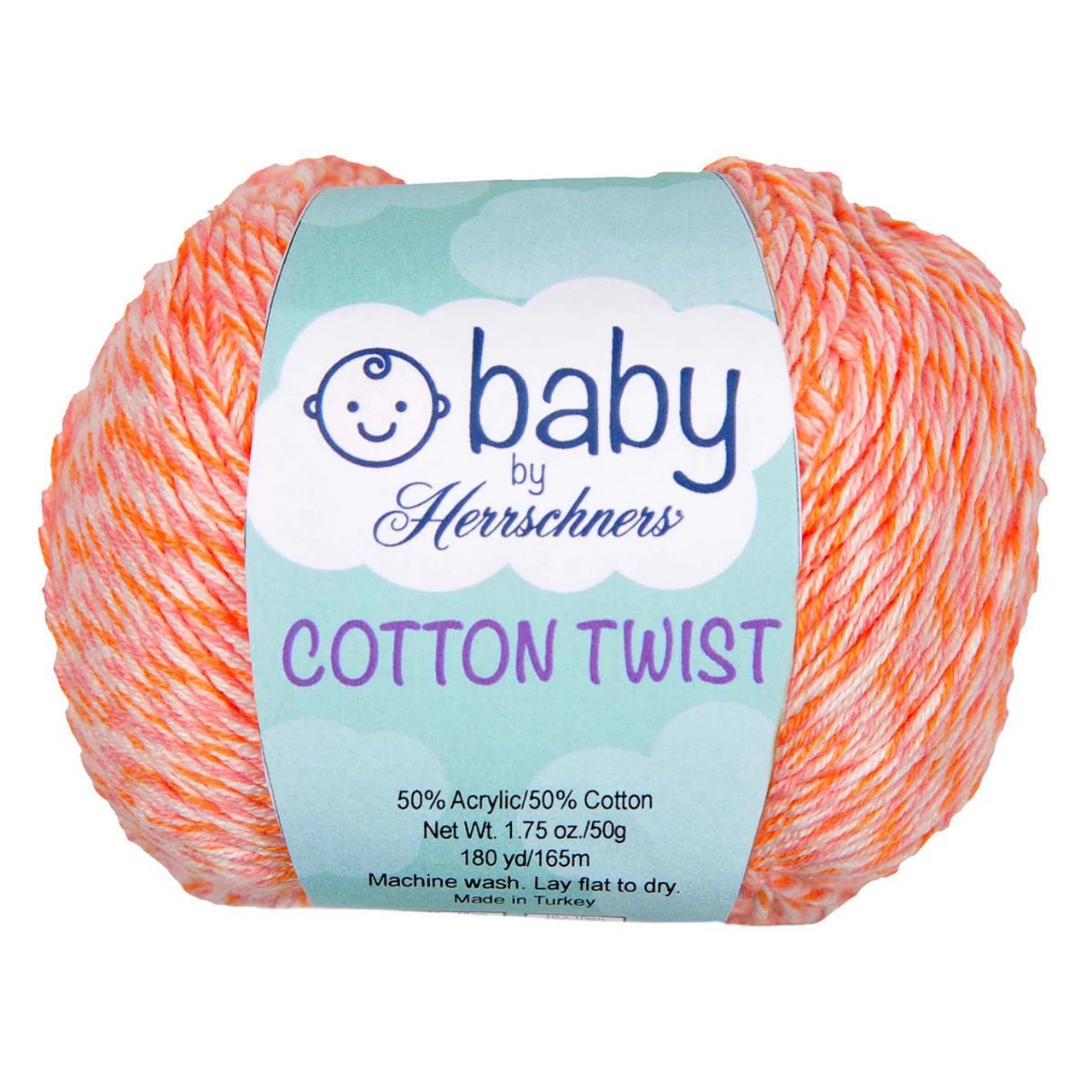 Create colorful, easy care projects for baby with Baby by Herrschners Cotton Twist yarn. Each acrylic/cotton blend ball contains 1.75 ounces (180 yards) of fine-weight yarn. This unique multicolor yarn twists four colors into one dynamic strand that knits and crochets into a gorgeous multicolored fabric that brings dimension to your stitches. It is machine washable for easy care. Available in a range of colors perfect for baby and children’s projects, from blankets and clothing to toys and accessories. Imported.