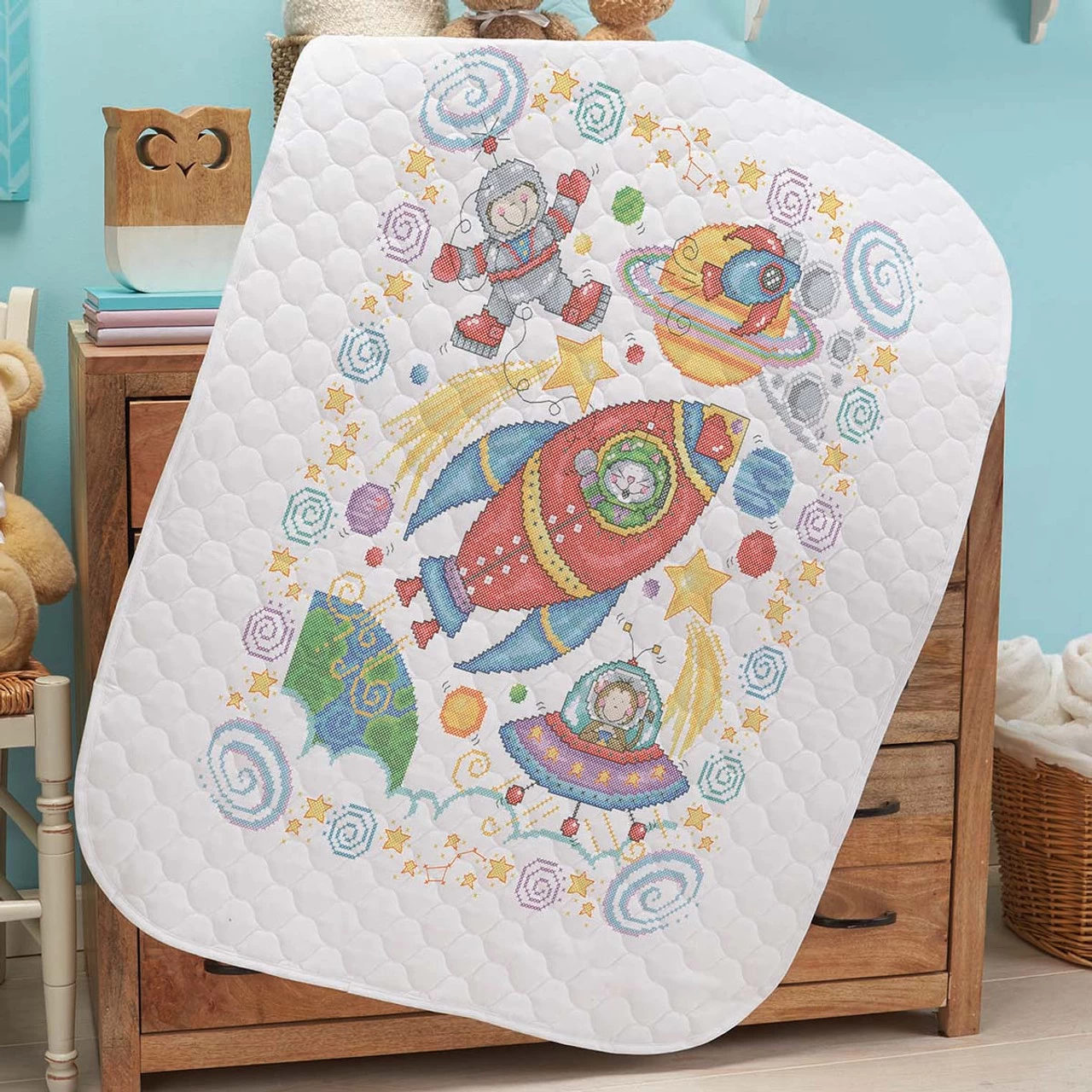 Give baby the coolest nursery in the galaxy with this adventurous design. Pre-quilted quilt is stamped for cross-stitch on white polyester/cotton fabric with a bound edge. Kit includes cotton floss and needle. 34 x 43″ (86 x 109cm). Made in U.S.A. and imported.