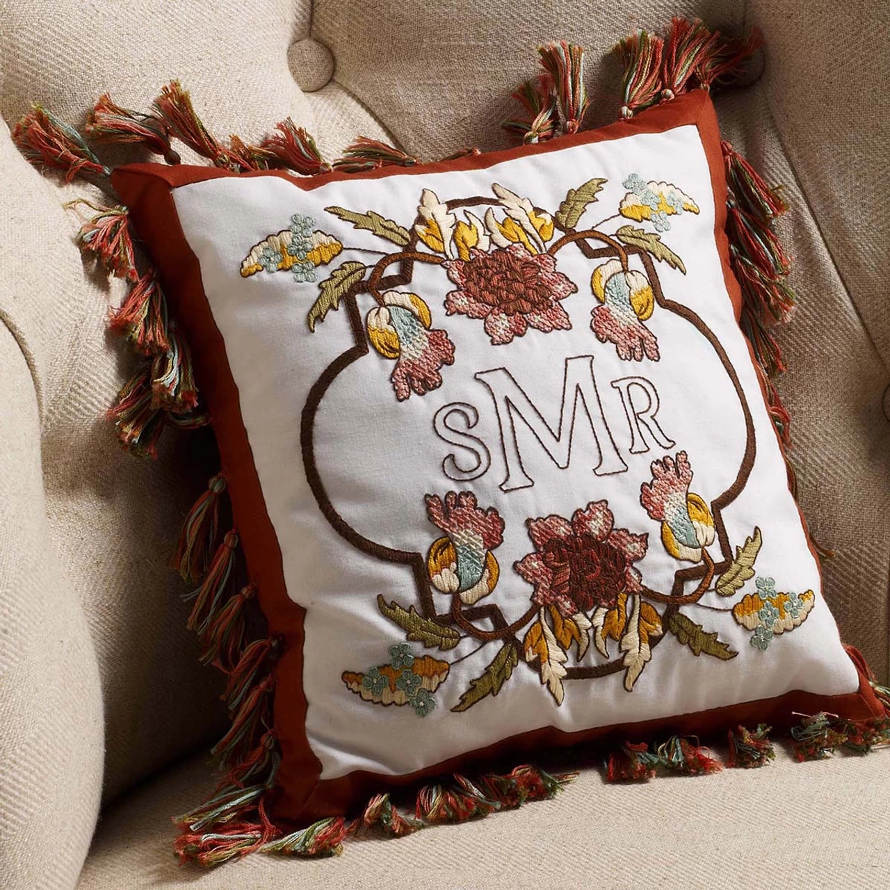 • Stamped embroidery design features a three-letter monogram surrounded by autumn flowers in rich shades of burgundy, gold, and light blue on a stylized border.