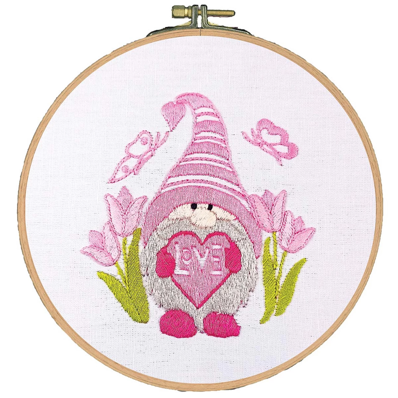 This embroidered gnome design features a gnome in a pink hat holding a large heart as he stands between two bouquets of pink tulips. The Valentine’s Day imagery make this adorable gnome design a sweet gift for someone you love. The design is stamped for embroidery on ivory fabric, meaning there is no need to transfer or trace the design. Simply follow the easy-to-read chart and instructions to stitch the design. Kit includes stamped ivory fabric, cotton floss, bamboo hoop, needle, and instructions. The finished design measures 6″ (15.2cm) dia. Imported from Europe