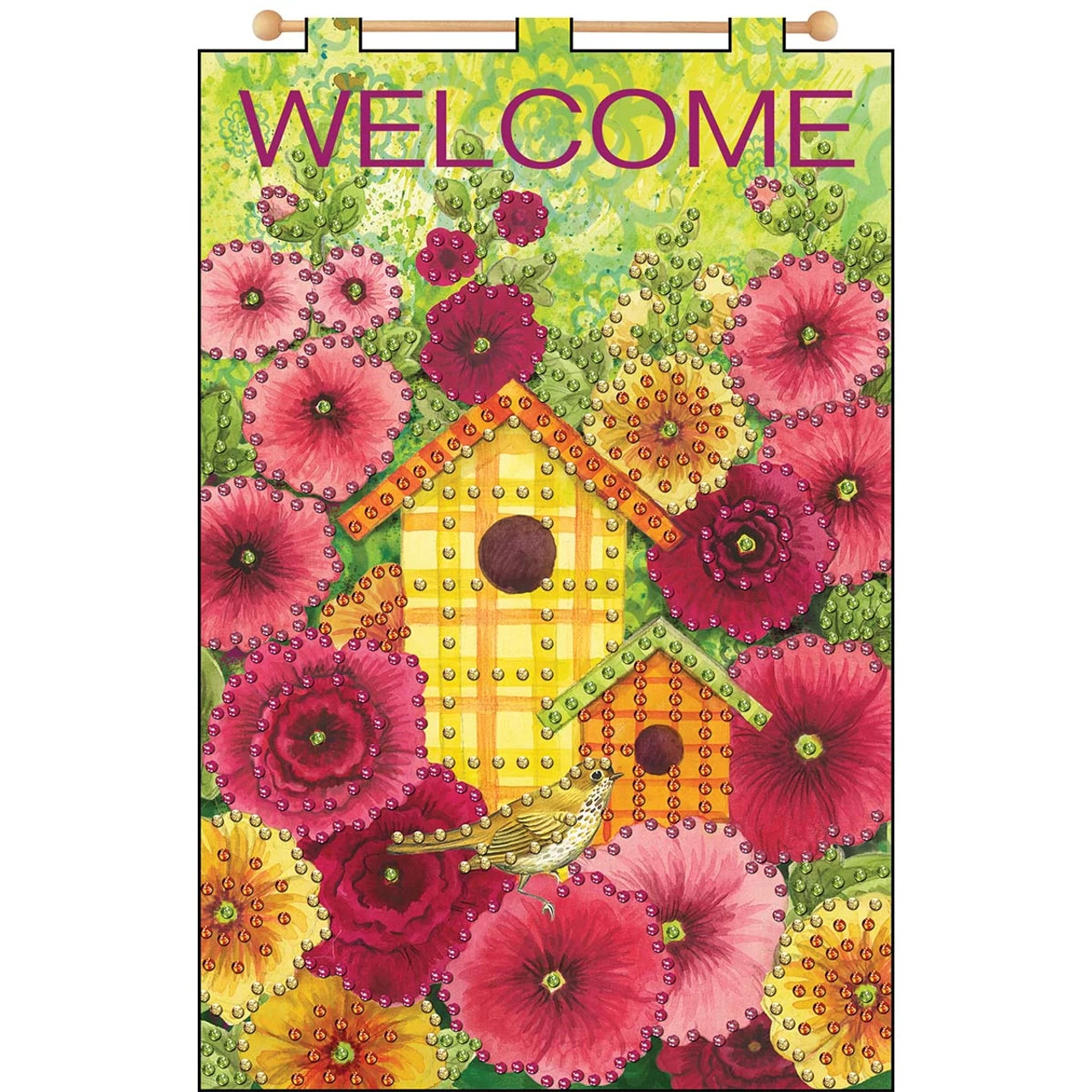 • The design features a yellow bird perched in front of two bright birdhouses surrounded by pink and yellow flowers under the word Welcome.
