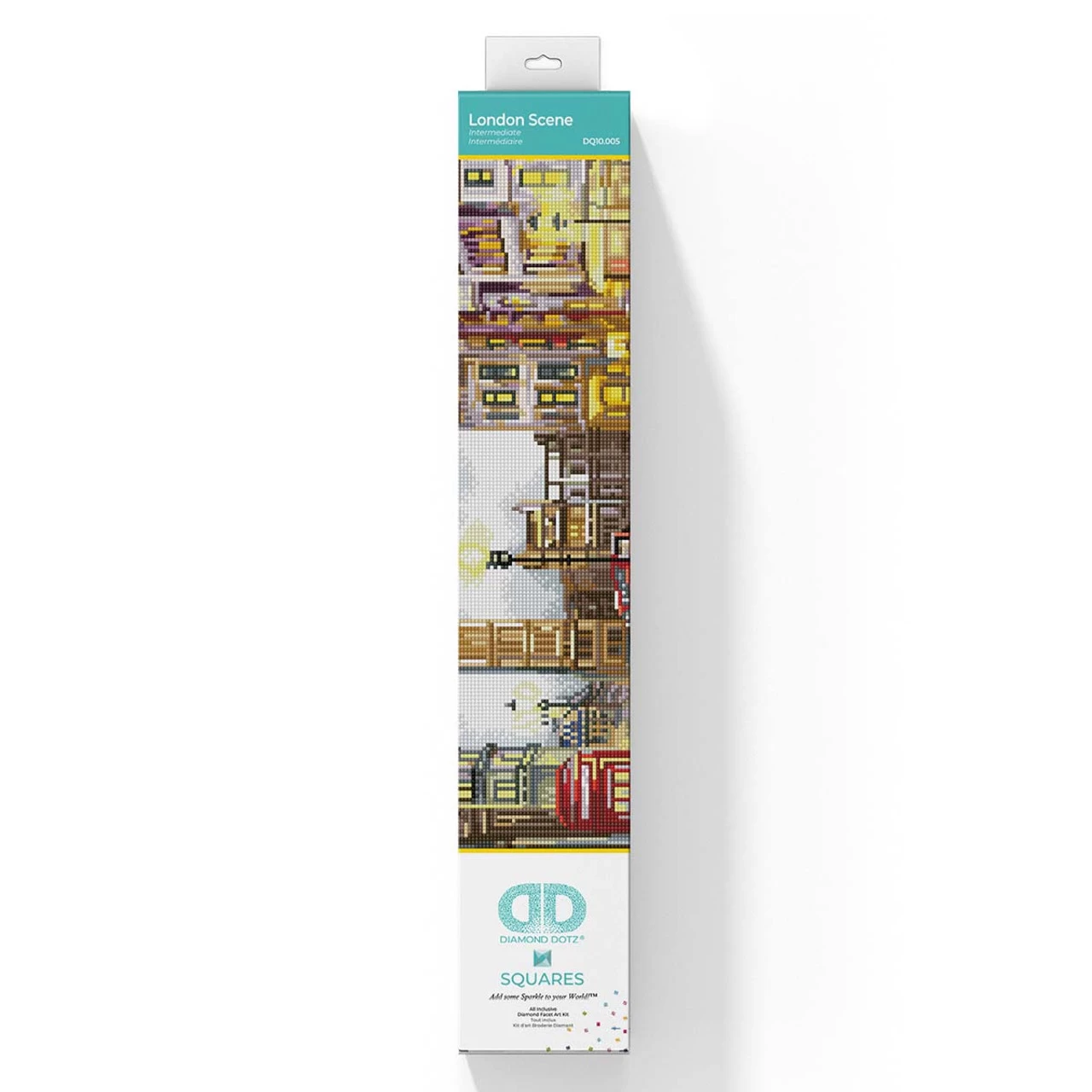 This diamond painting image features a charming view of London on a rainy day. People carrying umbrellas walk down wet sidewalks surrounded by iconic British sights like a red telephone booth, double-decker bus, and Big Ben in the background of this detailed street scene. Fun and easy diamond paintings are created by arranging sparkling gems on a pre-printed canvas, resulting in eye-catching wall art with a dazzling sparkle. Diamond painting kit includes pre-printed canvas, pre-sorted Diamond Dotz square gems, stylus, tray, wax caddy, and instructions. 20 x 15″ (51 x 38cm).