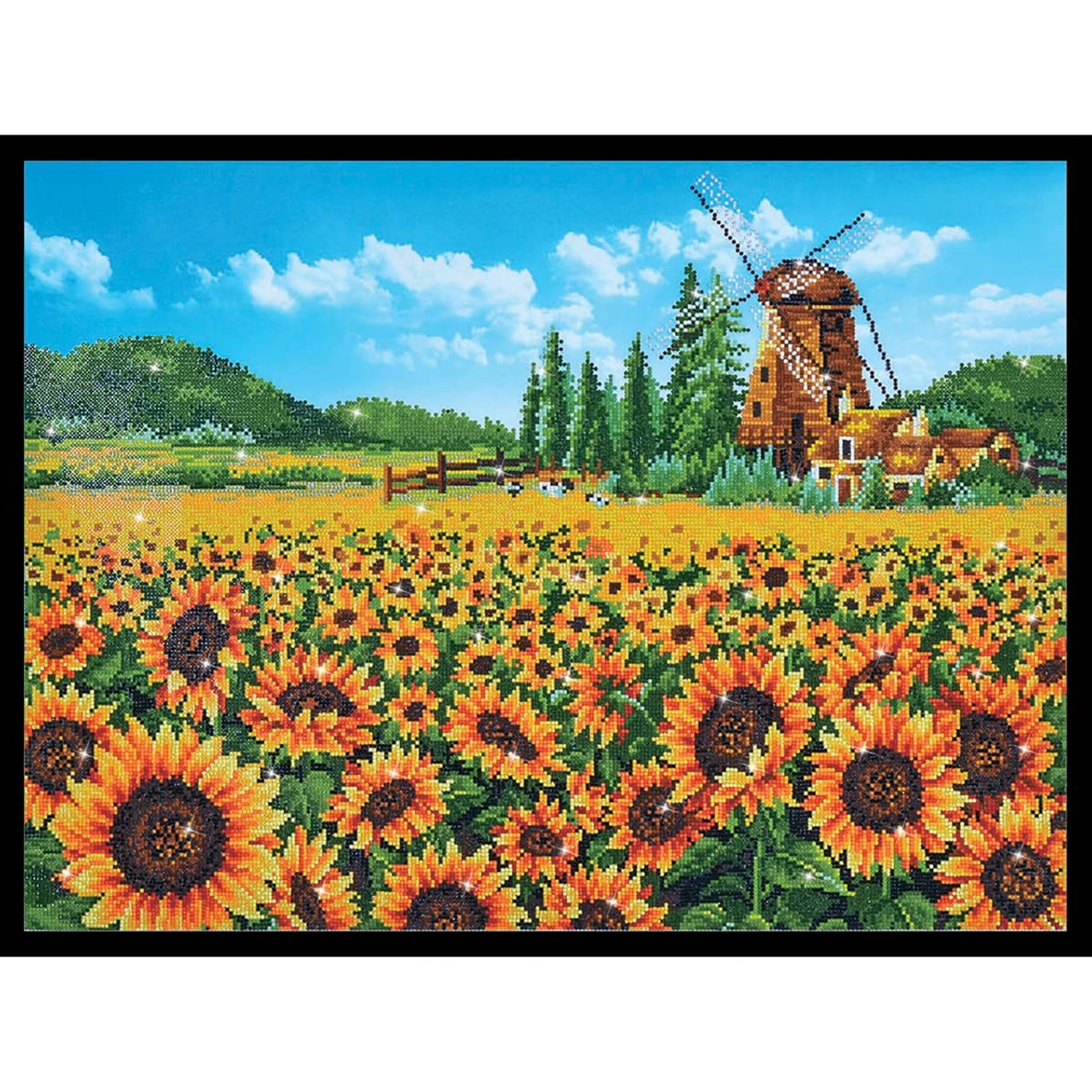 A charming windmill stands tall amid a sea of sparkling sunflowers in this stunning landscape to decorate your home. Diamond painting kit includes high-quality color-printed fabric, pre-sorted Diamond Dotz, stylus, craft tray, and wax caddy. 28 x 22″ (71 x 56cm).