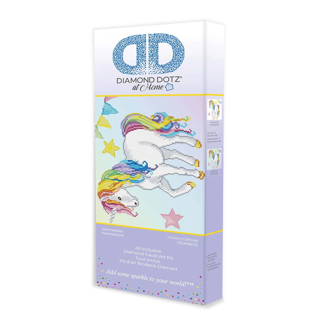 This diamond painting image features a whimsical portrait of a unicorn with a rainbow-colored mane and tail. Surrounded by colorful pennant banners and stars, this imaginative portrait makes great wall art for a child’s room. Fun and easy diamond paintings are created by arranging sparkling gems on a pre-printed canvas, resulting in eye-catching wall art with a dazzling sparkle. Diamond painting kit includes pre-printed canvas, pre-sorted Diamond Dotz round gems, stylus, tray, wax caddy, and instructions. 16 x 12″ (41 x 30cm).