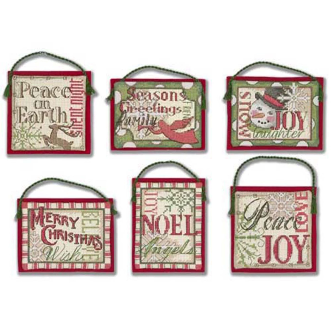 Set of 6. Express your sentiments with ornaments! Counted cross-stitch kit includes 14-ct ivory aida fabric, cotton floss, felt backing, needle, and instructions. Up to 4″ (10 cm), approximately. Made in U.S.A.