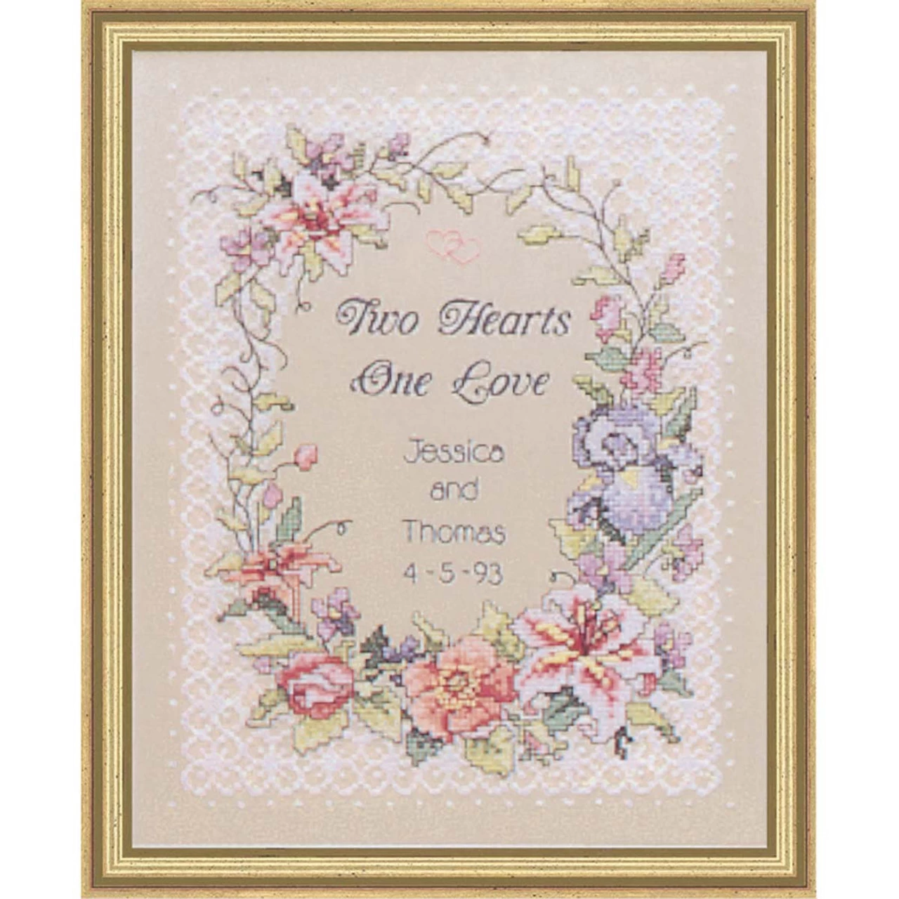 Kit contains cotton embroidery thread, design printed on tan fabric, needle, and easy-to-follow instructions including carbon paper and an alphabet and number chart for personalizing.