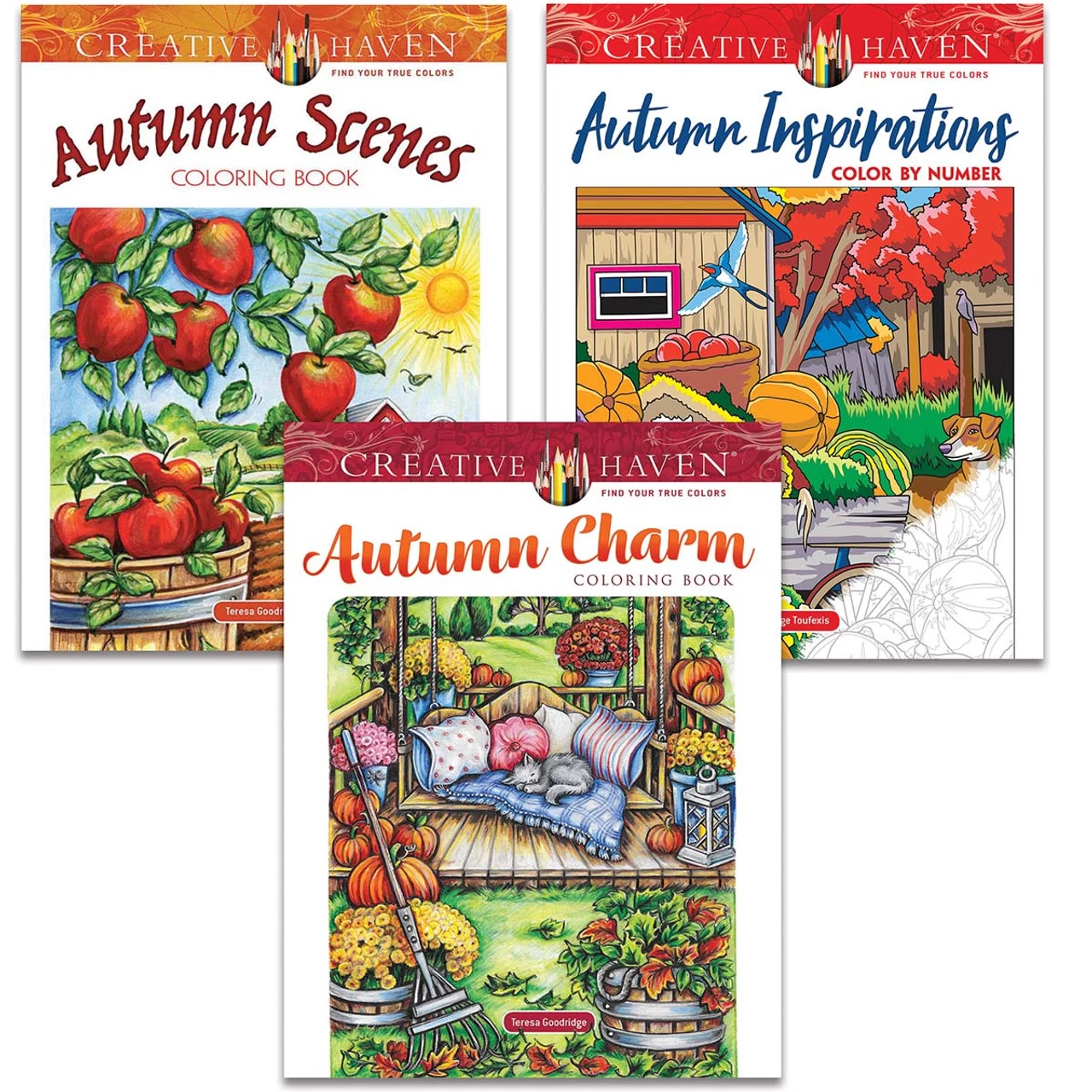 Admire the rich hues of autumn as you color your way through idyllic images of the harvest season in this set of three coloring books. This fall-themed set includes two coloring books with 31 and 30 designs each, and one color-by-number book with 46 designs. That’s 107 total designs in the set! Choose from designs including a variety of autumn landscapes, farm scenes, harvest settings, and brightly colored leaves that will have you dreaming of cool fall days. The designs can be colored with colored pencils, markers, or crayons. Softcover.