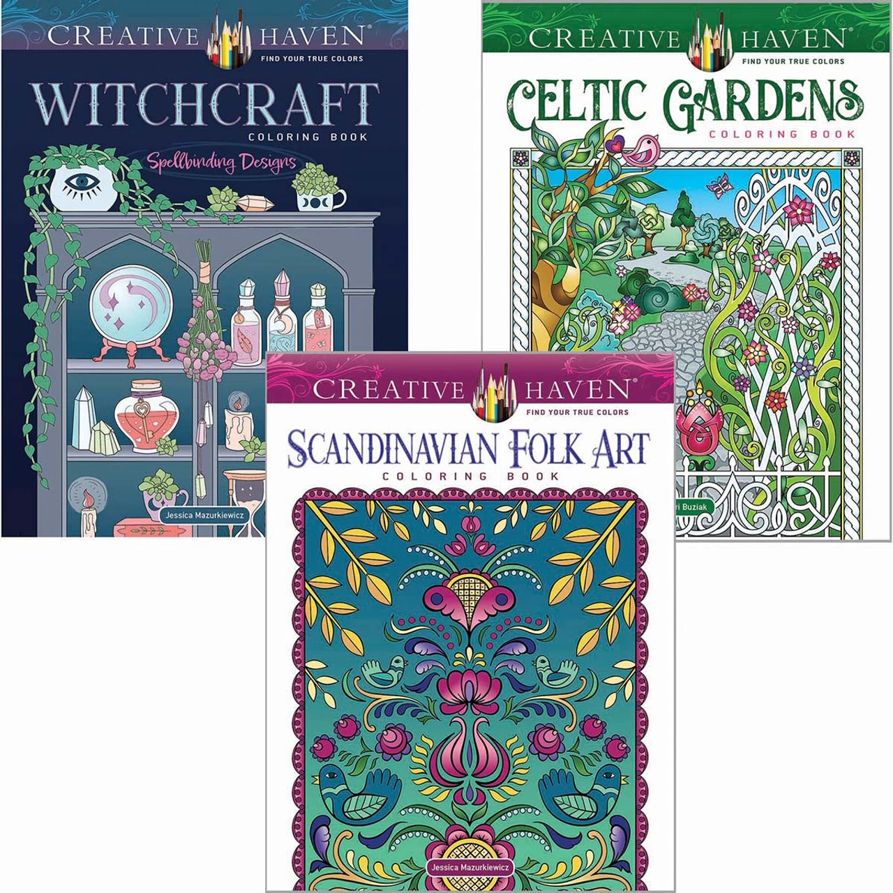 Explore a variety of cultural traditions as you color your way through this coloring book collection featuring a selection of Scandinavian folk art designs, gardens inspired by Celtic knotwork, and an enchanting collection of traditional and modern witchcraft designs. Each collection includes 31 detailed designs, with 93 total designs in the set. Pages are perforated and printed on one side only for easy removal. The designs can be colored with colored pencils, markers, or crayons. Softcover.