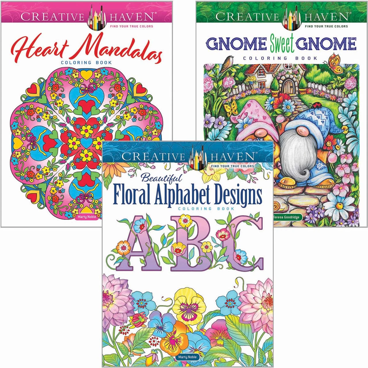 • Coloring designs feature gnomes in the garden, on the beach, camping, picnicking, ice skating, and more with forests, whimsical houses, sunflowers, toadstools, and other whimsical details; the alphabet letters A to Z and typographical words like Dream and Hope decorated with realistic flowers like roses, daffodils, daisies, pansies, and nature imagery like birds and butterflies; and circular mandala designs with heart patterns, flowers, birds, bees, and bows.