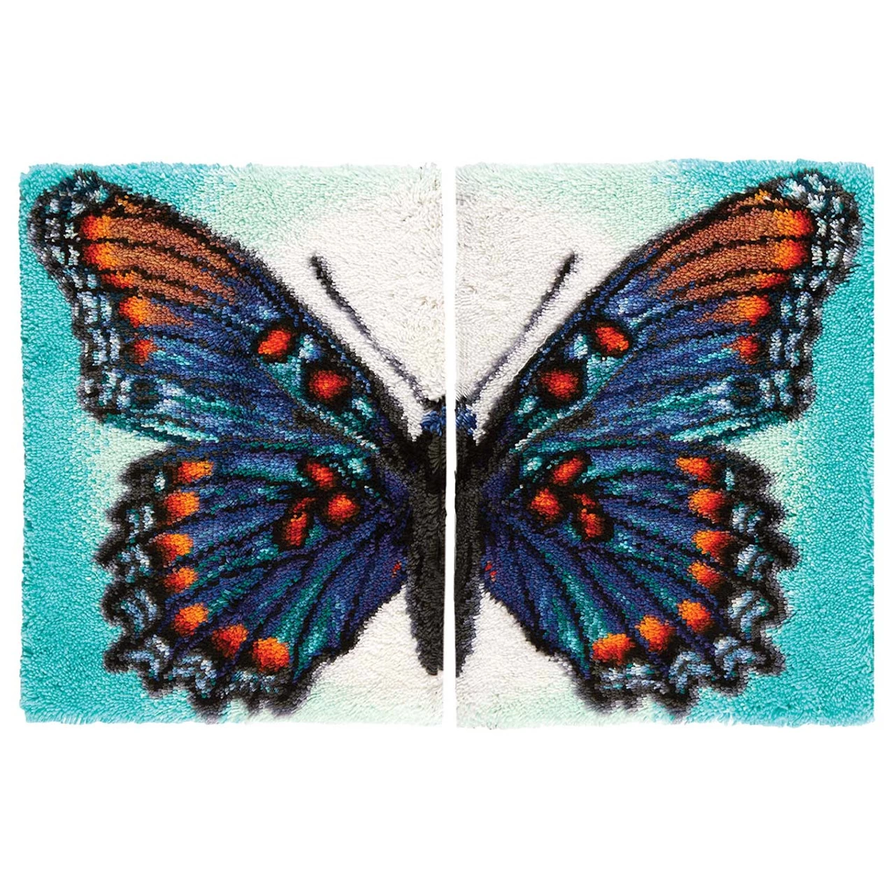 This diptych-style latch hook design is two projects in one! This special design features a striking butterfly with geometric patterns in rich blue with fiery orange accents. The design is made up of two 24 x 30″ (61 x 76cm) sections, which can be displayed separately or hung together to create one large 48 x 30″ (122 x 76cm) showpiece. Kit includes 3.75-mesh gridded canvas, lofty pre-cut 100% acrylic yarn, clear vinyl storage bag, easy-to-follow chart, and instructions. Latch hook tool, rug binding, and non-slip backing not included. The higher-gauge canvas of this project allows for a high level of detail in the finished design. Imported.