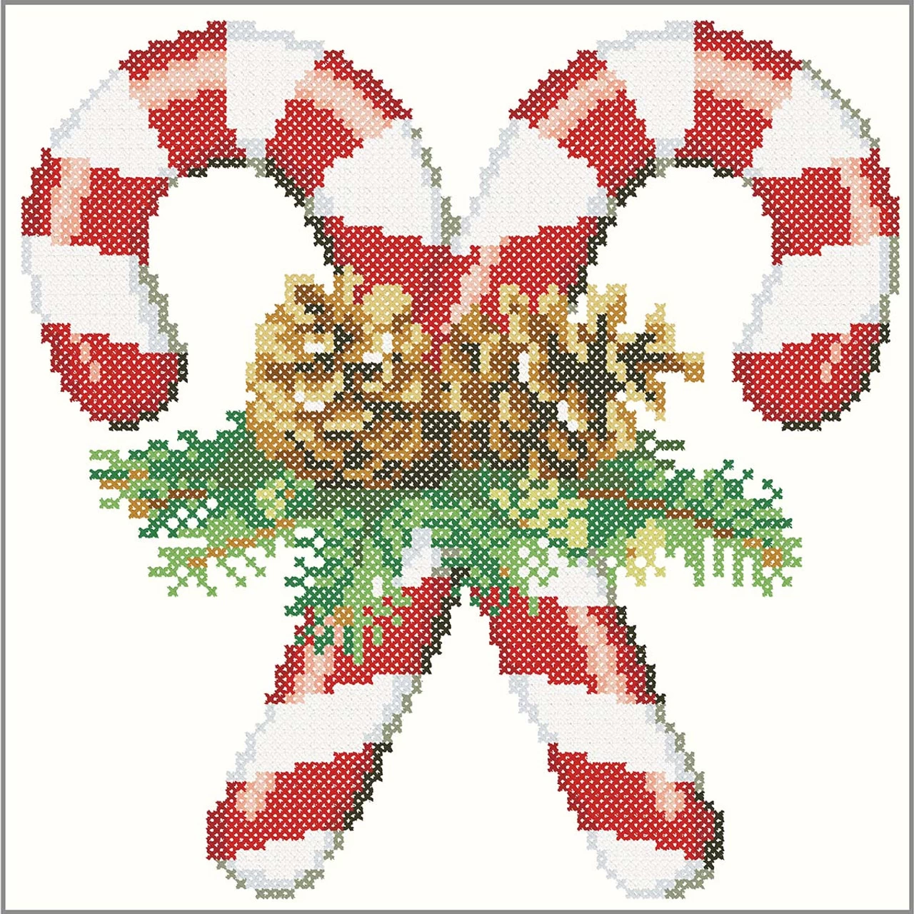 • These quilt blocks are ready for stitching with two candy canes tied together with evergreen branches and pinecones.