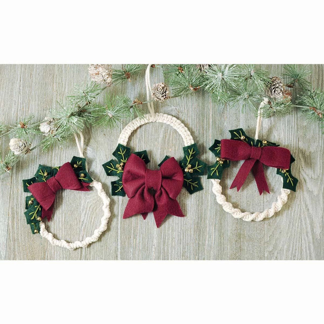 Simple style makes these macramé wreaths on-trend with modern Christmas décor. Kit includes felt, craft cord, cotton floss, brass ring, jingle bells, and needle. Set of six. 5½ × 5½” (14 x 14cm). Imported.