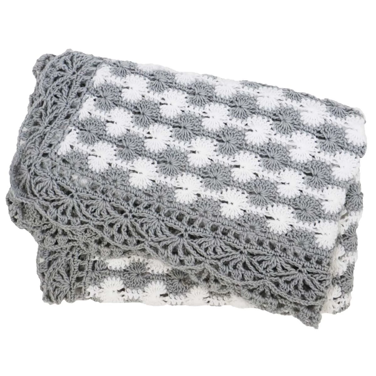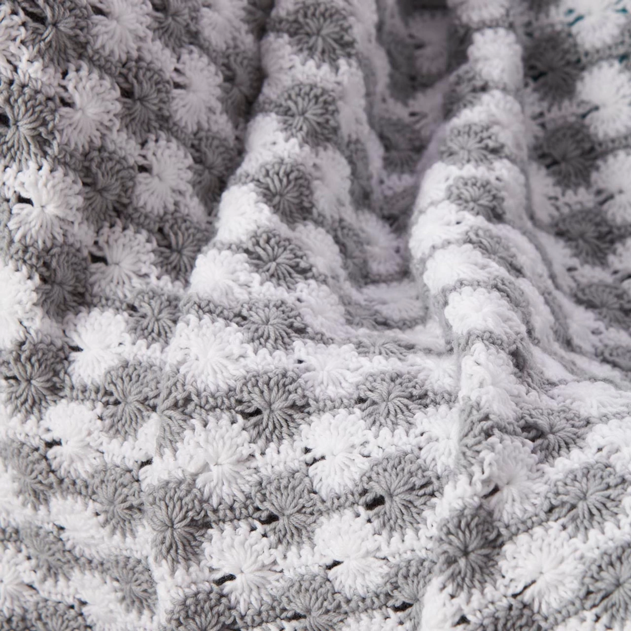Double crochet clusters in shades of white and gray form cloudlike curls on this breezy throw crocheted in Herrschners Worsted 8 yarn. The houndstooth-like pattern has a lacy border for a fun and playful twist on this geometric design. This easy crochet throw is a great project for beginners or any crocheter looking for a fun, relaxing project. Along with the yarn and easy crochet instructions, this afghan kit comes complete with a clear vinyl storage bag, yarn needle, and a label for personalization. This 41 x 52″ (104 x 132cm) design requires a US size I-9 (5.5mm) hook to complete (not included). Imported.