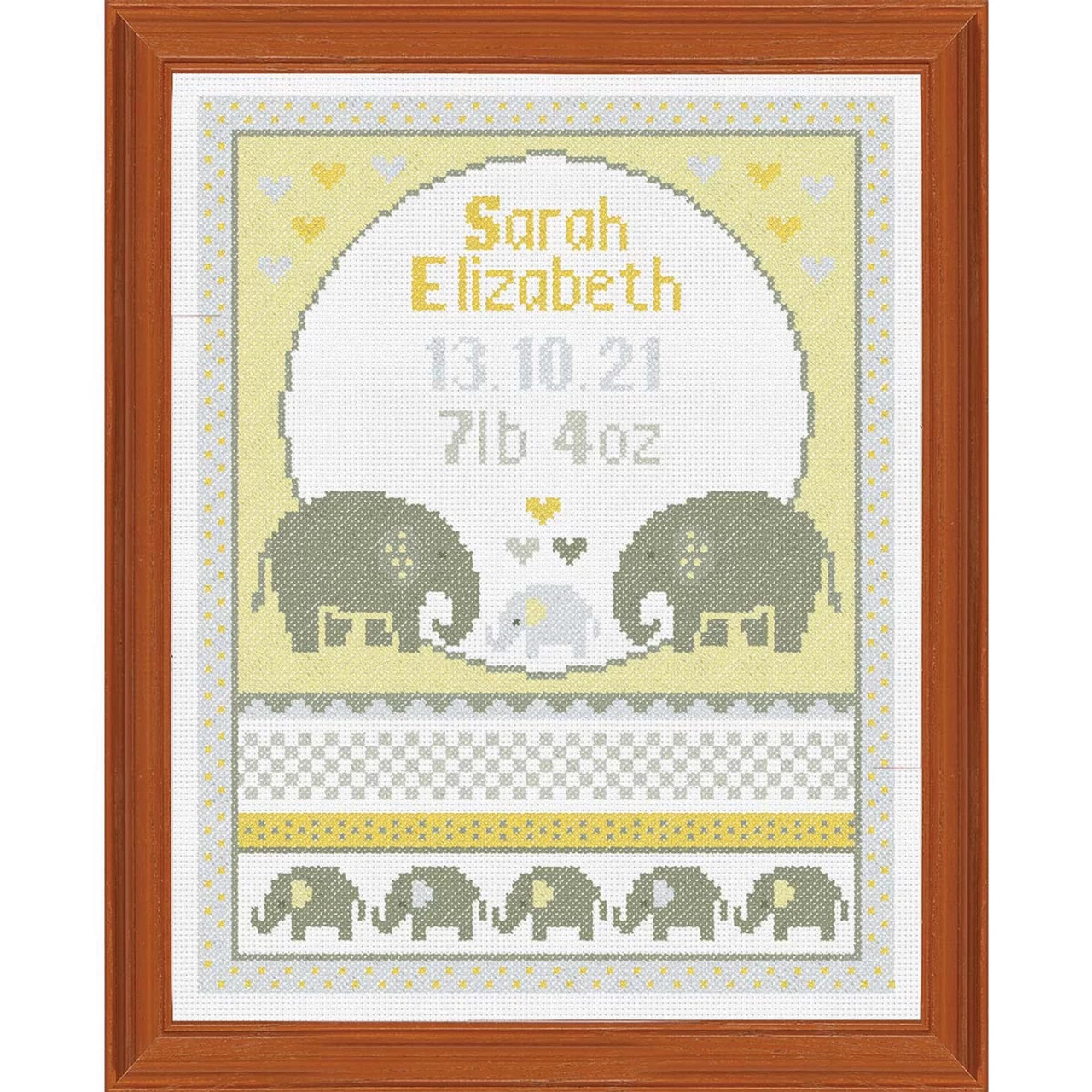 • Design features gray elephants on a white background and a place to stitch baby’s name, birthdate, and birth weight.