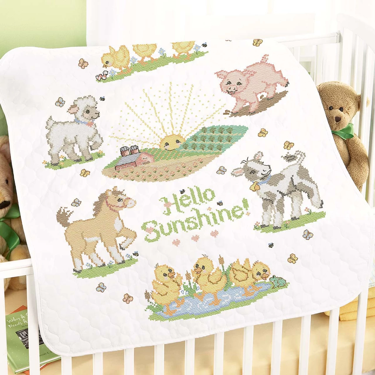 Fill your little one’s nursery with sunshine! Stamped for cross-stitch on white pre-quilted, pre-finished polyester/cotton fabric. Floss sold separately. 34 × 43″ (86 x 109cm). Made in U.S.A.