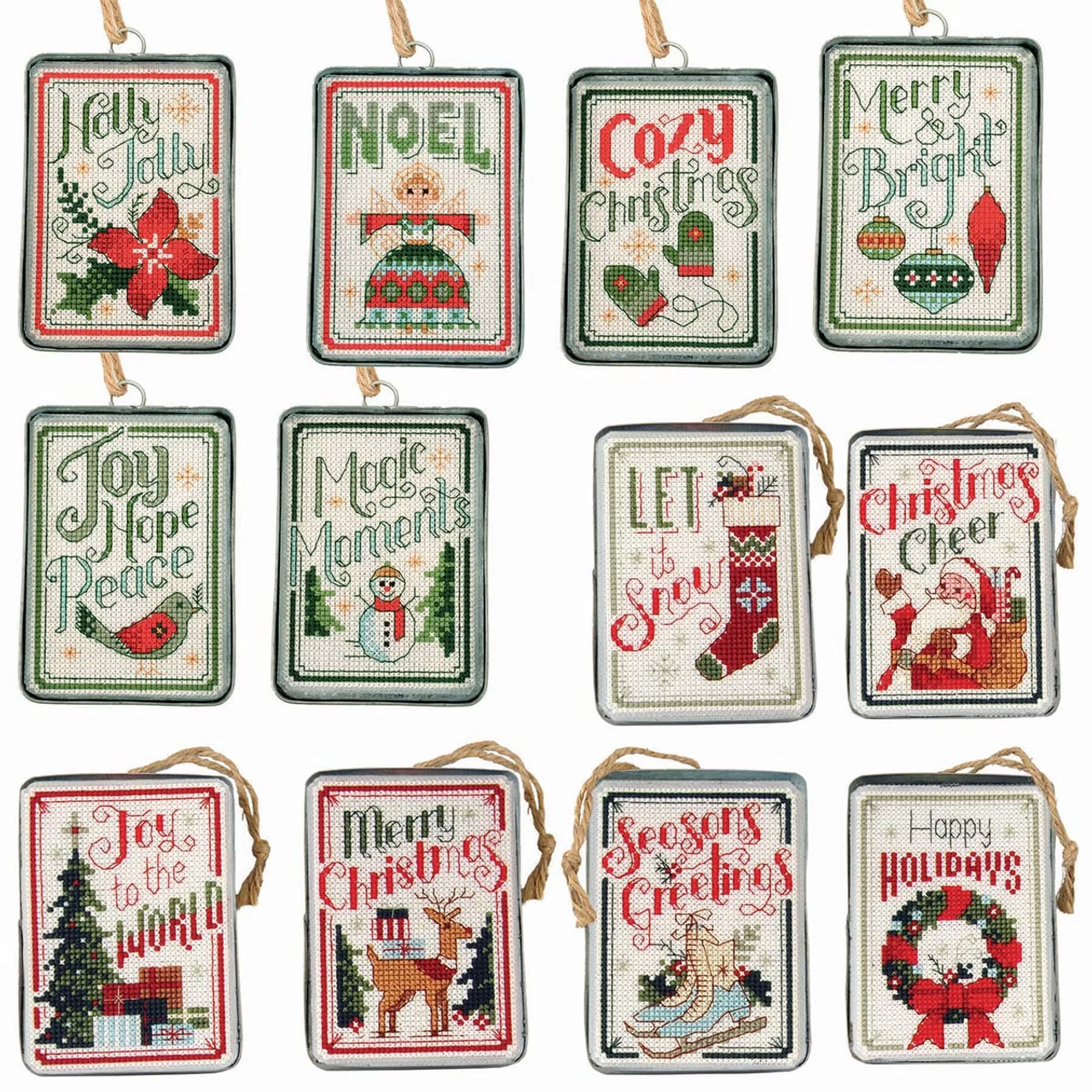 Iconic imagery and vintage styling create a picture-perfect Christmas in these mini counted cross-stitch ornaments. The adorable counted cross-stitch Christmas ornaments feature classic Christmas symbols like wreaths, stockings, reindeer, Christmas trees, Santa, snowmen, ornaments and more, all embellished with elegant typography. Messages like “Merry and Bright, “Happy Holidays,” and “Holly Jolly” raise Christmas spirit as they peek out from the branches of your tree. The designs are stitched on 14-ct. plastic canvas. This durable, stiff plastic is perforated with round holes for stitching and will not unravel like fabrics can. It is a great fabric choice for both beginning stitchers and those with more experience. This complete counted cross-stitch kit includes 14-ct. plastic canvas, cotton floss, floss organizer, tin ornaments, needle, and instructions. This bundled set includes 12 total ornaments measuring 3 x 4″ (7.6 x 10.2cm). Finishing the ornaments is easy: simply trim the designs and insert them into the included tin frames. Imported.