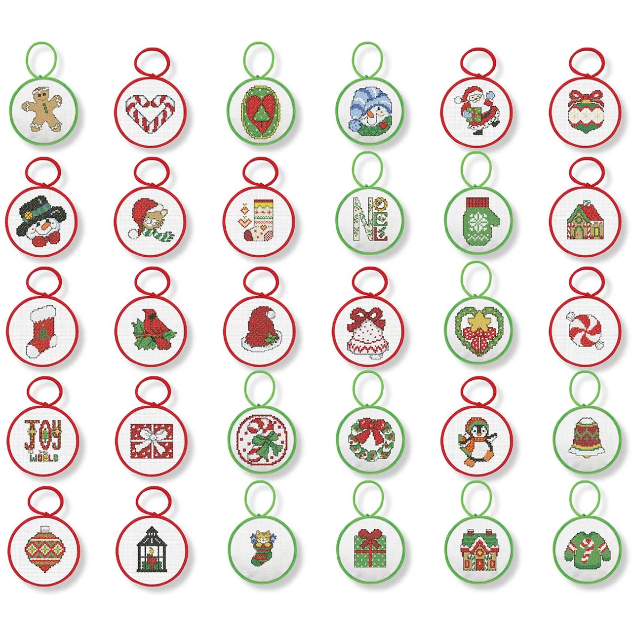 This collection of 30 counted cross-stitch ornaments celebrates the best of the Christmas season with miniature holiday motifs. Designs include Santa, snowmen, a Christmas wreath, gingerbread houses and a gingerbread man, ornaments, presents, mittens, a stocking, and many more merry motifs that make great decorations for your tree. The finished designs can also be attached to gifts as a fun gift tag. The designs are stitched on white 14-ct. aida cloth. The easy-to-see squares of aida cloth make it a great fabric choice for both beginning stitchers and those with more experience. This complete counted cross-stitch kit includes white 14-ct. aida cloth, cotton floss, floss organizer, needle, and instructions. Cording and finishing materials are not included. This set of 30 ornaments measures 3 x 3″ (7.6 x 7.6cm) each. Imported.