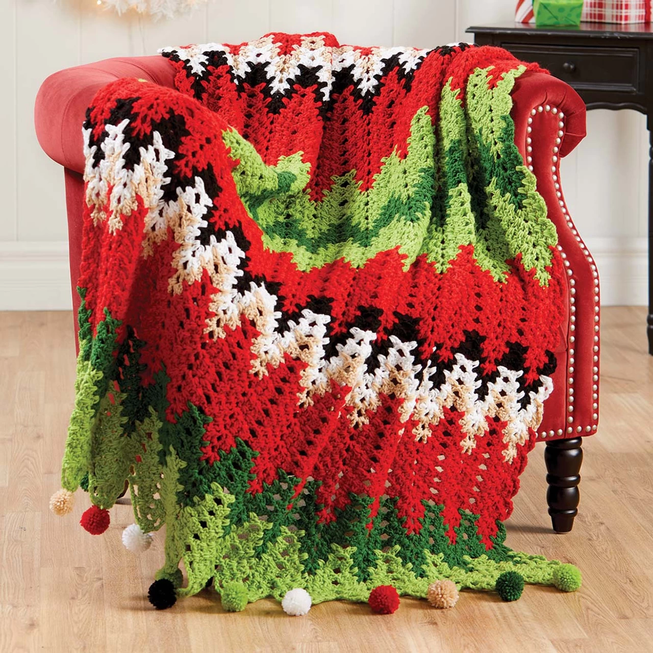 This merry Christmas afghan is crocheted with a combination of Herrschners Worsted 8 and Herrschners Worsted 3 yarns. Along with the yarn and intermediate crochet instructions, this holiday afghan kit comes with a clear zippered storage bag, yarn needle, and a label for personalization. This 45 x 63″ (114 x 160cm) design requires a US size I-9 (5.5mm) hook to complete (not included). Imported.