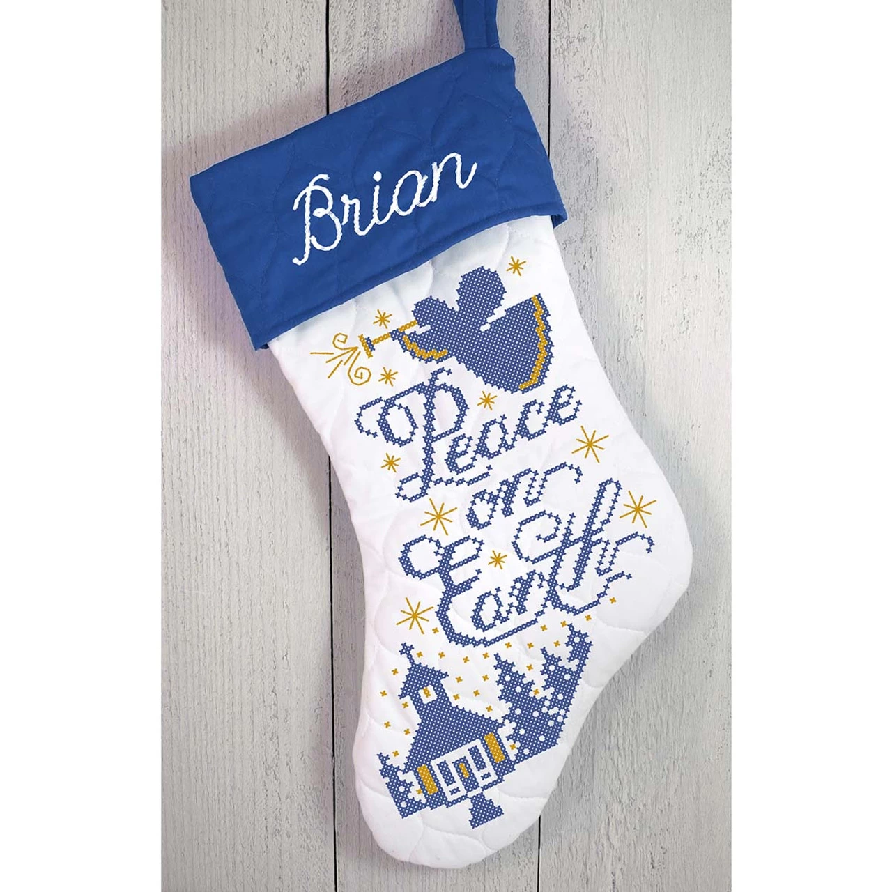 • This cross-stitch stocking is ready for stitching with a blue silhouette of an angel, the words Peace on Earth, and a scene of Bethlehem.