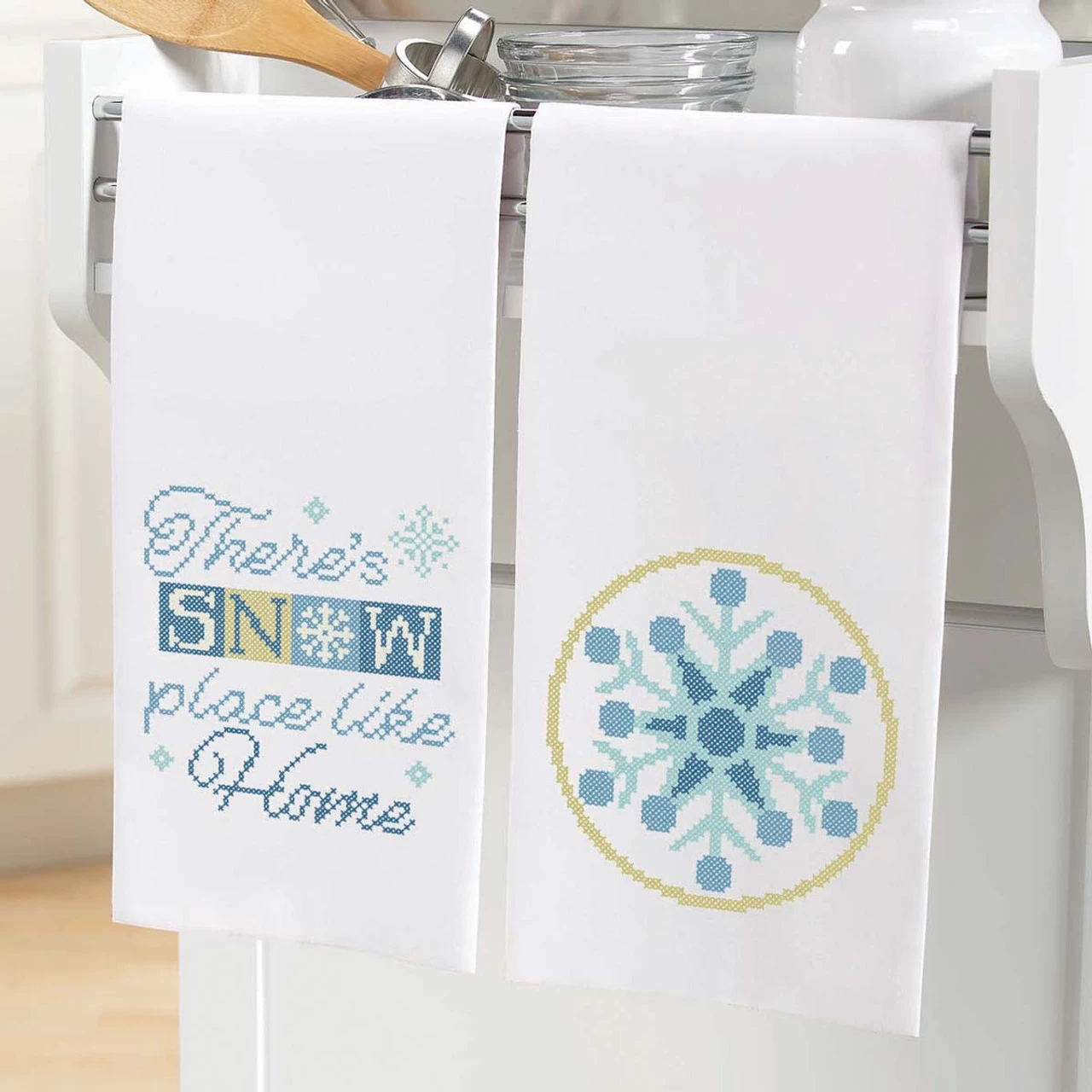 • These pre-finished towels are ready for stitching with snowflakes and the phrase “There’s snow place like home.”