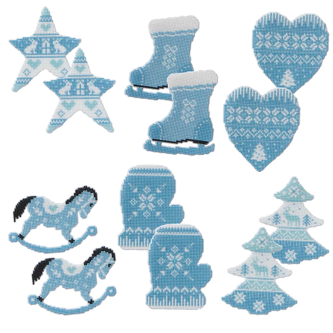 Beloved symbols of the season stitched in icy blue make a traditional, yet modern embellishment to your tree. Counted cross-stitch kit includes 14-ct. plastic canvas, cotton floss, floss organizer, and needle. Set of 12. Up to 4¼” (10.8cm). Imported.