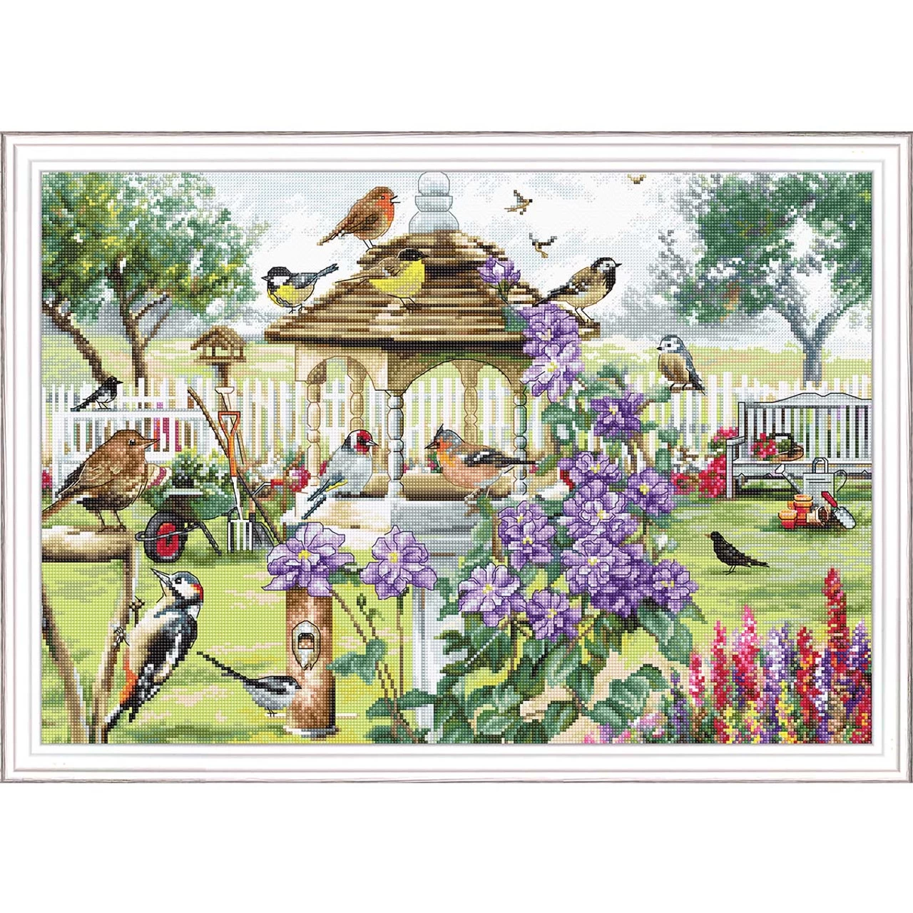 Delight in a charming view of a lively backyard garden. Counted cross-stitch kit includes white 16-ct. aida cloth, cotton floss, and needle. 17 × 12″ (43 x 30cm). Imported from Europe.