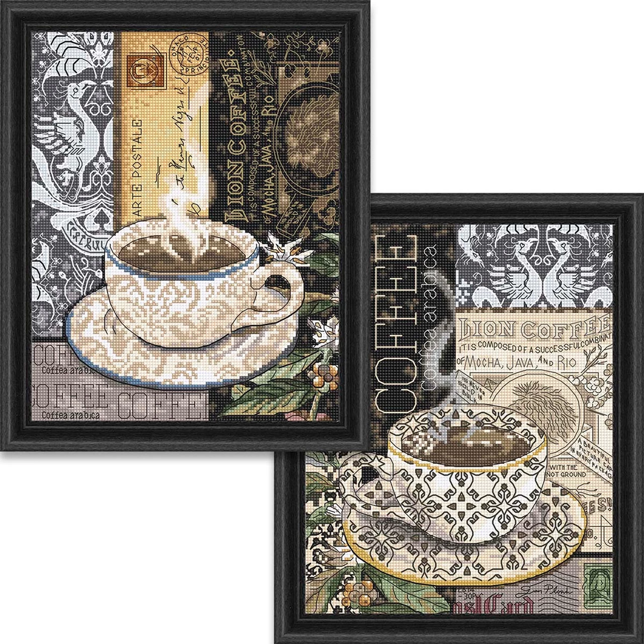 Sip your morning brew in a home coffeehouse with these sophisticated prints on your kitchen wall. Counted cross-stitch kits include cream Zweigart 16-ct. aida cloth, cotton floss, and needle. 7 × 9″ (17.8 x 22.9cm). Imported from Europe.