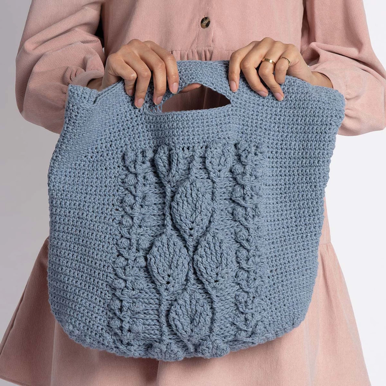 A leafy texture adorns the front of this tote and adds a touch of whimsy. Kit includes Lily Sugar ‘n Cream yarn and intermediate crochet instructions. 14 × 17″ (36 x 43cm). Imported.