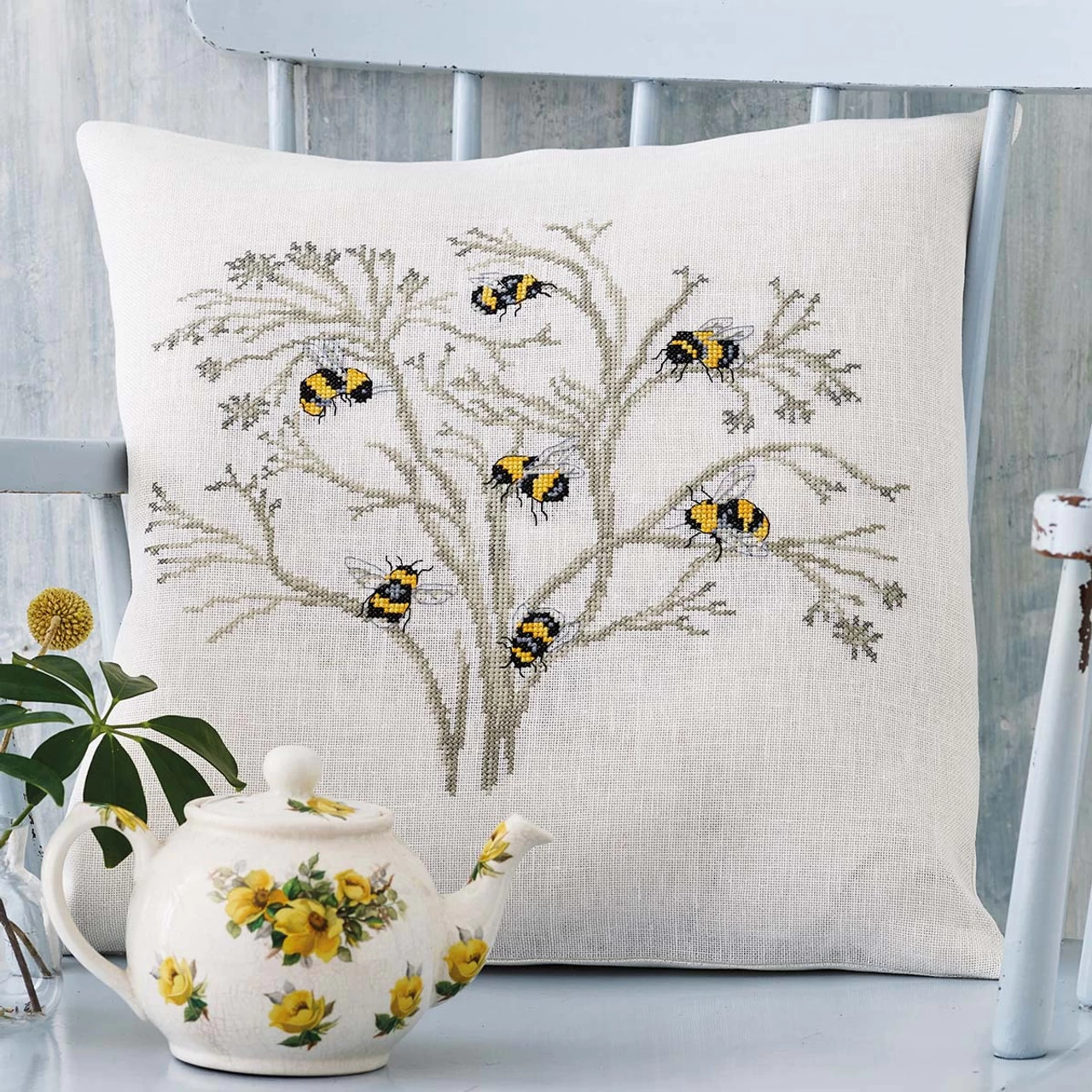 • Design features seven bright yellow and black bees buzzing around a flowering plant stitched in neutral hues.
