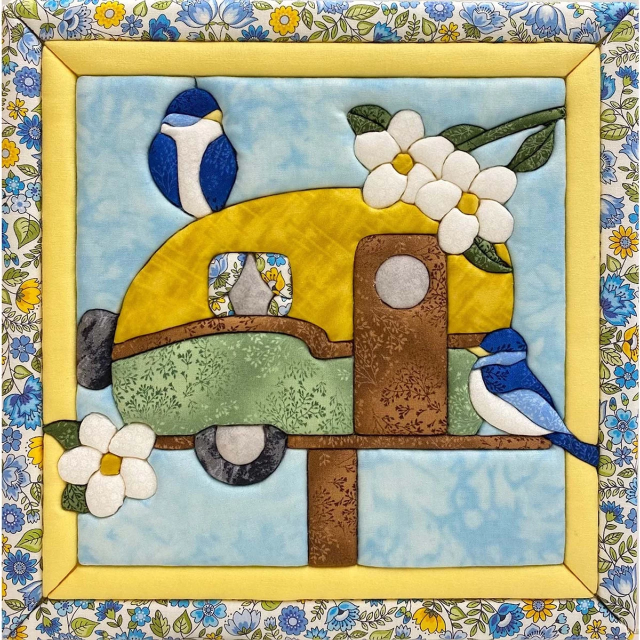 • No-sew quilted wall art features two birds sitting on a birdhouse shaped like a vintage camper surrounded by three little white flowers.