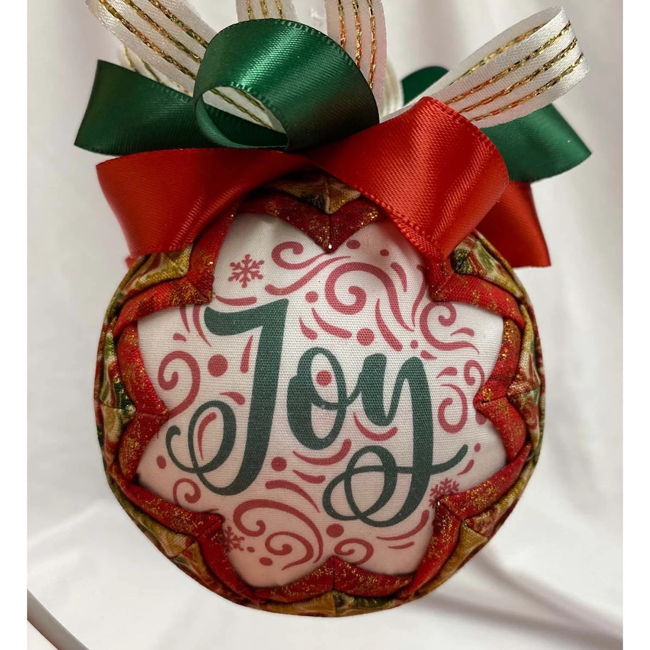 • No-sew quilted ornament is created with a typographical display of Joy surrounded by holiday fabrics in shades of red and gold. Fabrics may vary.