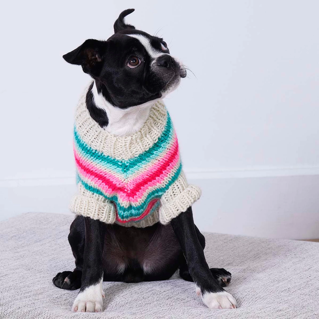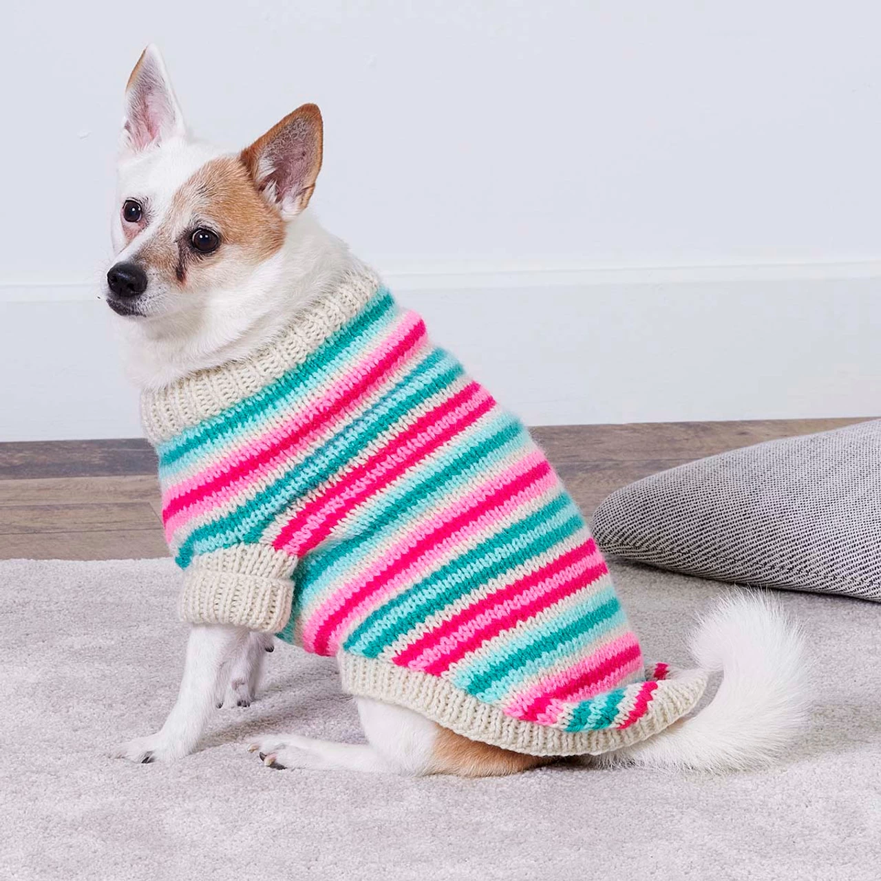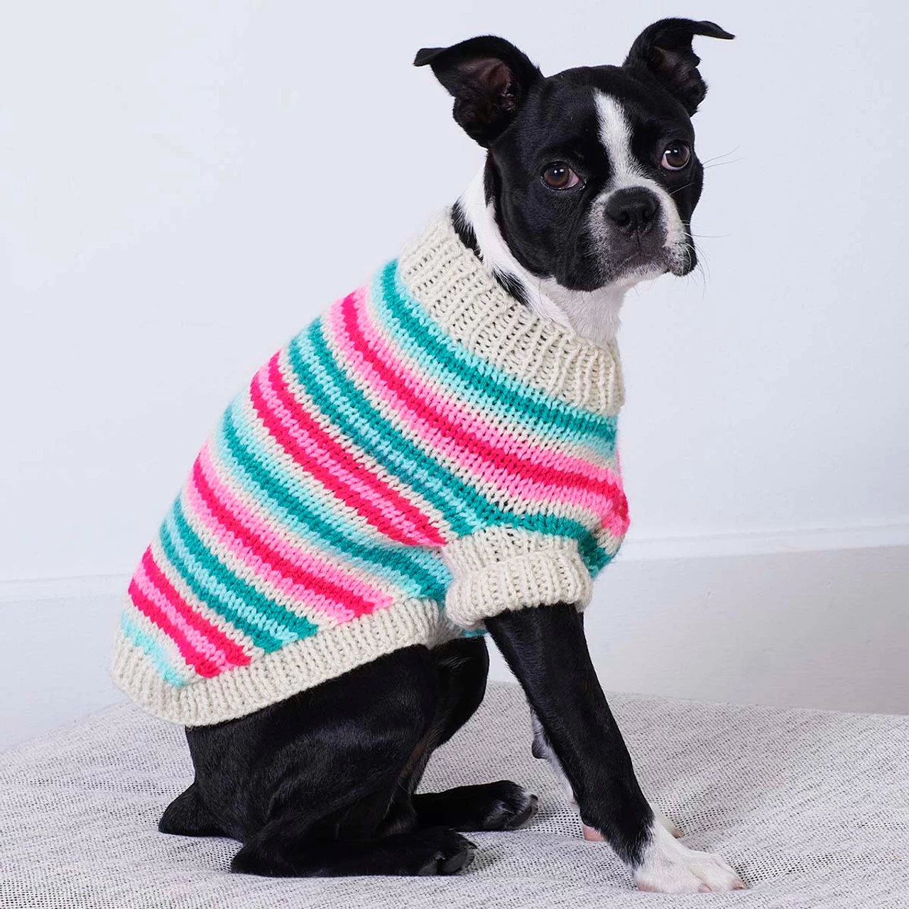 Keep your pup cute and cozy in this fun striped sweater coat. This easy dog sweater design is knit with Red Heart Super Saver yarn in a combination of bright and colorful stripes to show off your furry friend’s fashionable side. Available in sizes Small through Extra Large, this easy knit dog sweater requires US size 8 (5mm) straight needles, US size 7 (4.5mm) 36″ circular needle, and a set of US size 7 (4.5mm) dpn to complete (not included). Imported.
