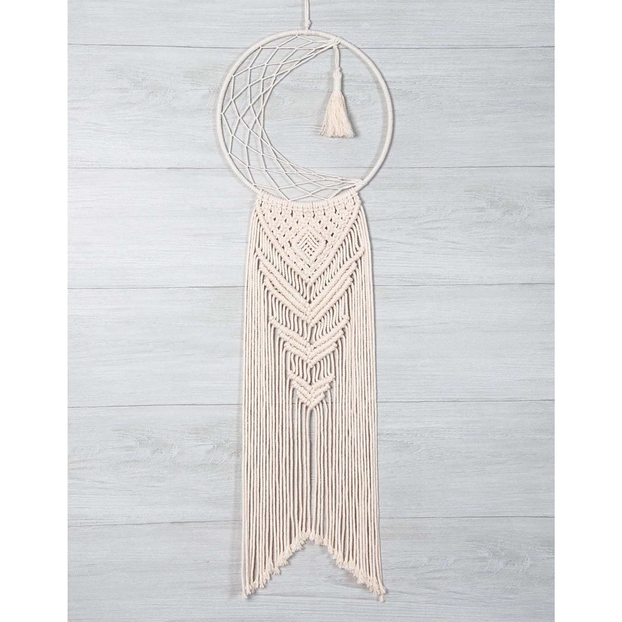 • This wall hanging design features a crescent moon with a tassel inside a wrapped hoop with a knotted design and long fringe hanging below.