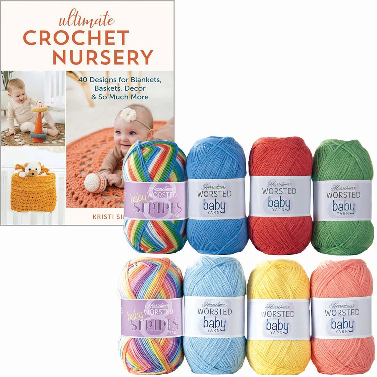 Save on this amazing holiday bundle to create a marvelously modern nursery for baby! This delightful collection of baby patterns from designer Kristi Simpson contains a variety of baby projects that are both cute and practical for new parents. All projects are designed in colors and styles popular in today’s modern nurseries. Because we know you’ll want to get stitching right away, we’re pairing this book with 2 yarn packs of Herrschners Worsted 8 Baby yarn. Each yarn pack includes 4 balls of yarn—1 ball of self-striping Herrschners Worsted 8 Baby Stripes yarn and 3 coordinating solid shades of Worsted 8 Baby yarn. With 2 yarn packs in this bundle, you get 8 balls of yarn to make multicolor baby projects that are always perfectly coordinated.
