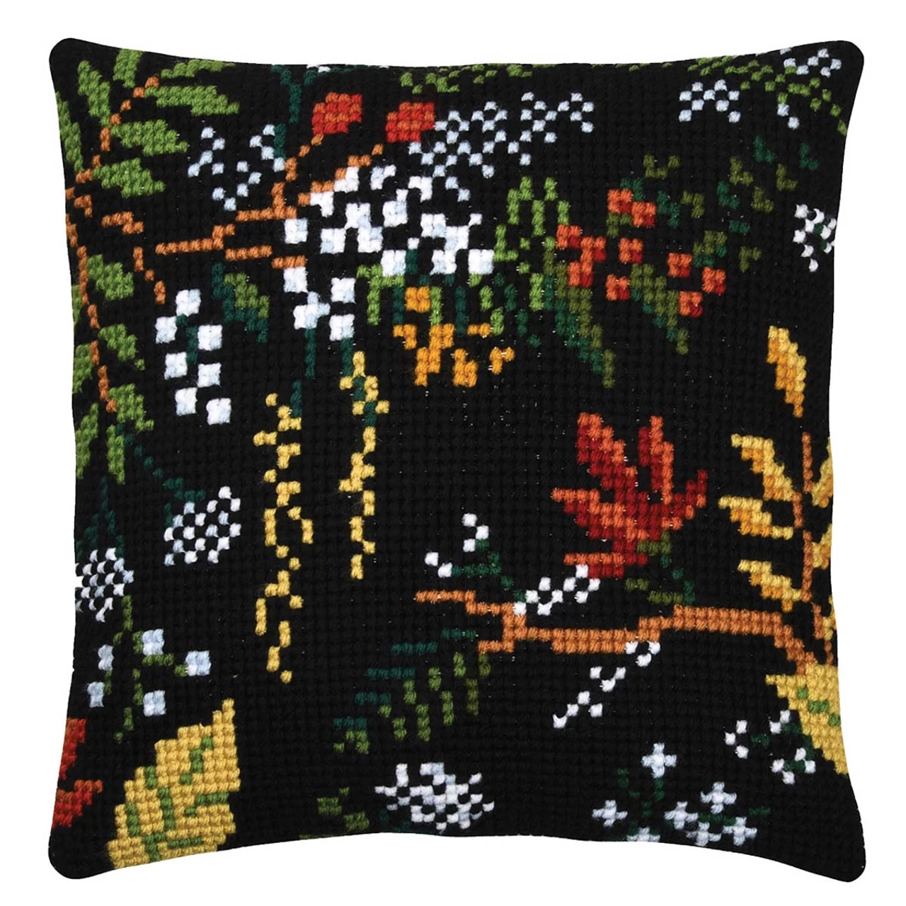 • Design features an array of autumn leaves, berries, branches, and blossoms in fall colors stitched on black.