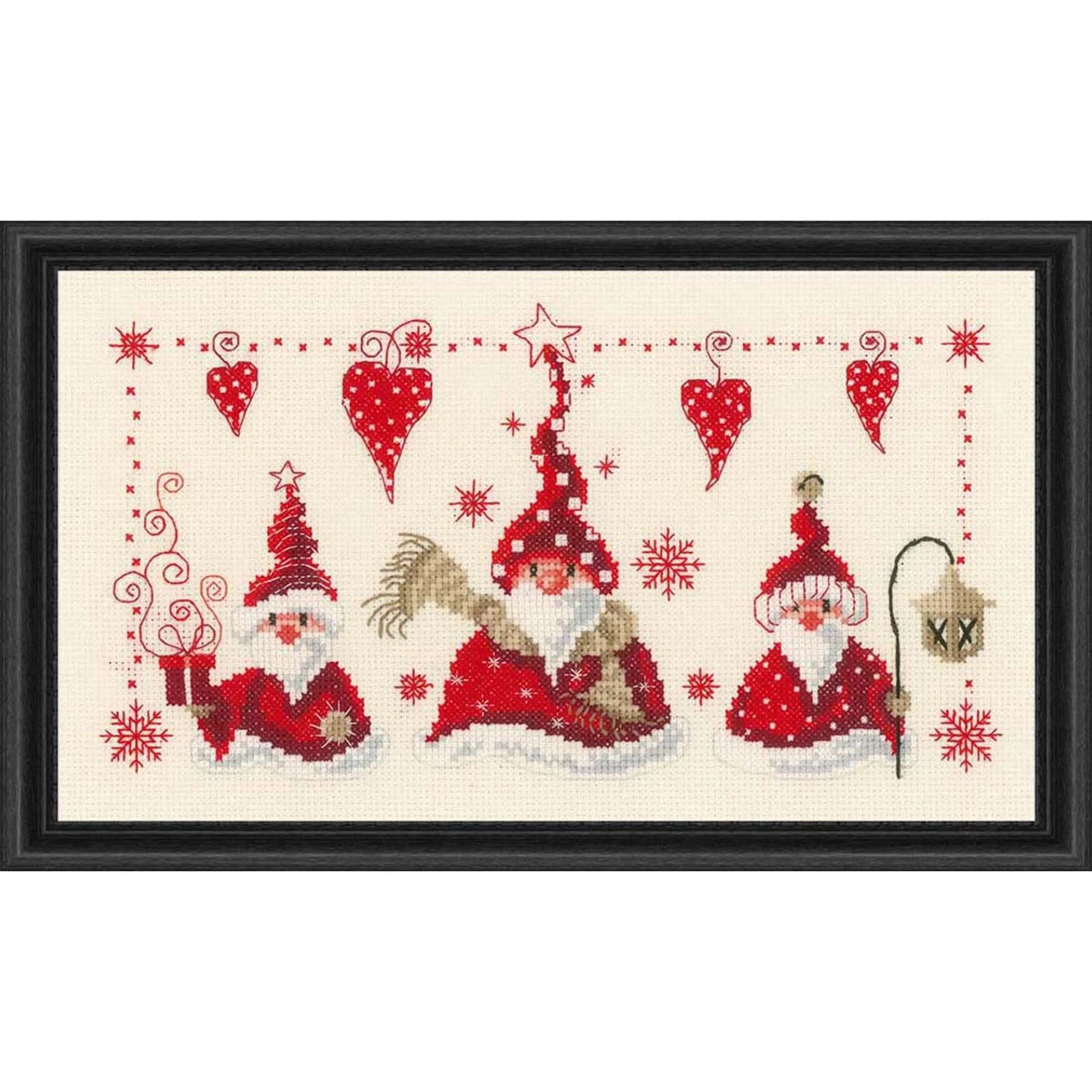 Santa and his elves are ready to make your holidays merrier in this festive design stitched in cheerful red and white. Counted cross-stitch kit includes ecru 14-ct. fabric, cotton floss, and needle. 12 x 6¾” (30 x 17.1cm). Imported from Belgium.